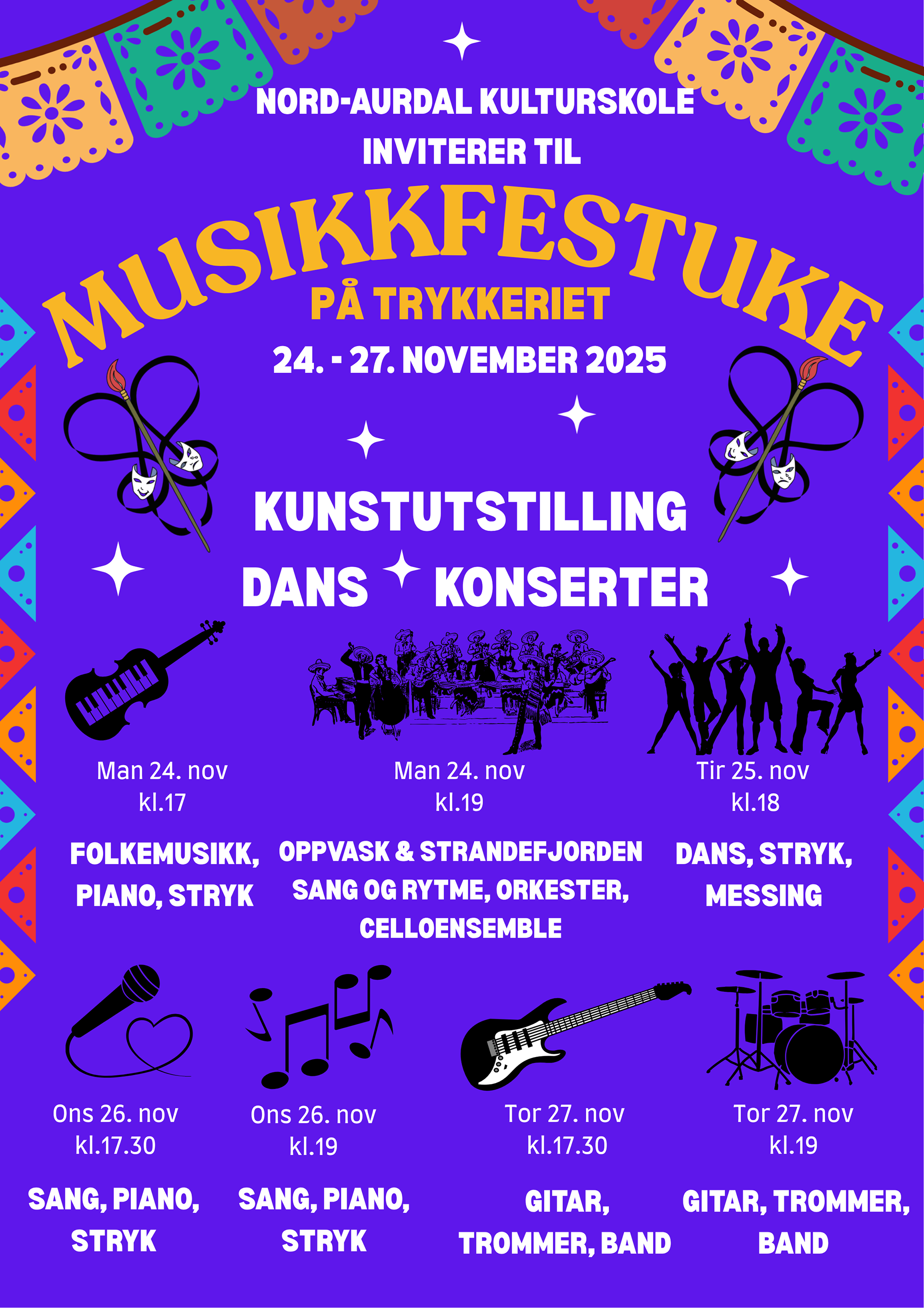 Mandag 24. til torsdag 27.november vil Kulturskolen arrangere 7 konserter/forestillinger.